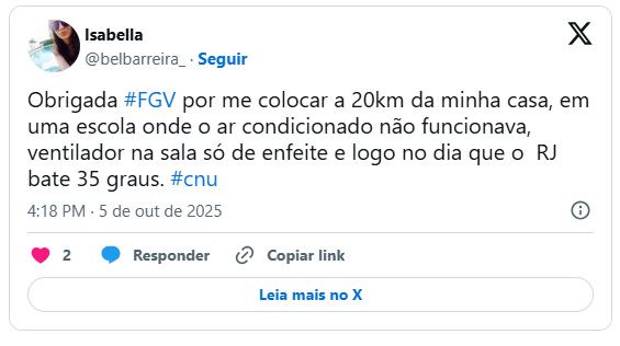 No X, uma usuária identificada como Isabella reclamou que foi designada a fazer a prova a 20 km de sua residência. Segundo ela, na escola onde realizou o exame, o ar-condicionado não funcionava e o ventilador disponível não dava vazão suficiente.