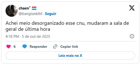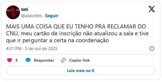 Outra candidata, chamada Tati, contou que seu cartão de inscrição não havia sido atualizado com a sala, e ela precisou pedir ajuda à coordenação para encontrar a sala correta. Já Chaen considerou o CNU desorganizado, mencionando que a mudança de sala foi feita de última hora.