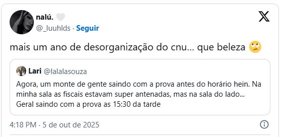 Lari, por sua vez, relatou que viu candidatos saindo com o caderno de provas antes do horário previsto: “geral saindo com a prova às 15h30”, escreveu.
