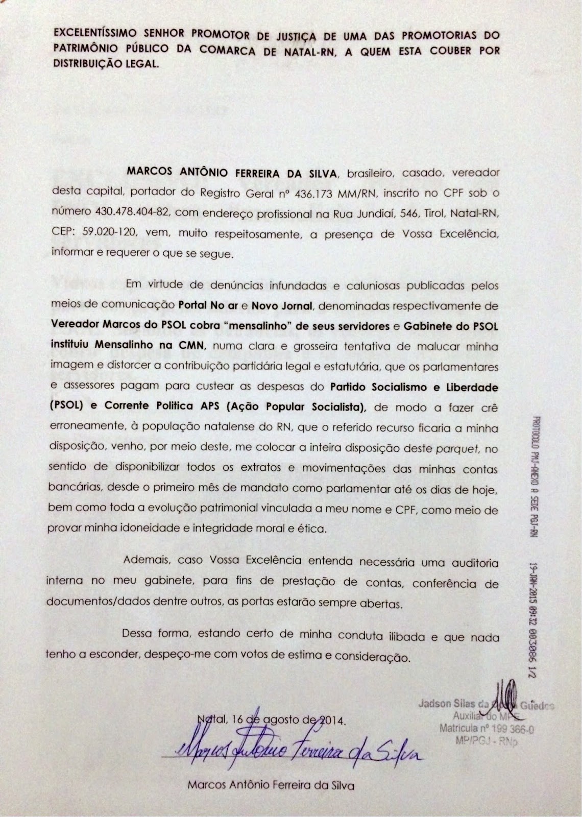 Venho a público comunicar a população natalense e norte rio-grandense, conforme tínhamos antecipado em entrevista, que acabei de protocolar no MP/PGJ – Ministério Público/Procuradoria Geral de Justiça, o procedimento N° 003086 1/2, disponibilizando o meu sigilo bancário e fiscal, assim como, abrindo todo o meu gabinete para processo investigativo da falsa denúncia de existência de Mensalinho ou Mensalão.