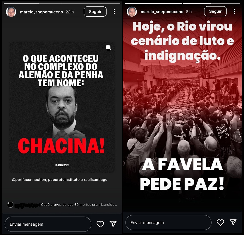 Outra publicação do mesmo perfil chamou a operação de “chacina”, ignorando que a ação da polícia mirava líderes do Comando Vermelho, como Edgar Alves de Andrade, o “Doca”, que continua foragido. Segundo as autoridades, a operação foi planejada para desarticular a cúpula do CV, responsável por comandar o tráfico e espalhar terror nas comunidades cariocas.