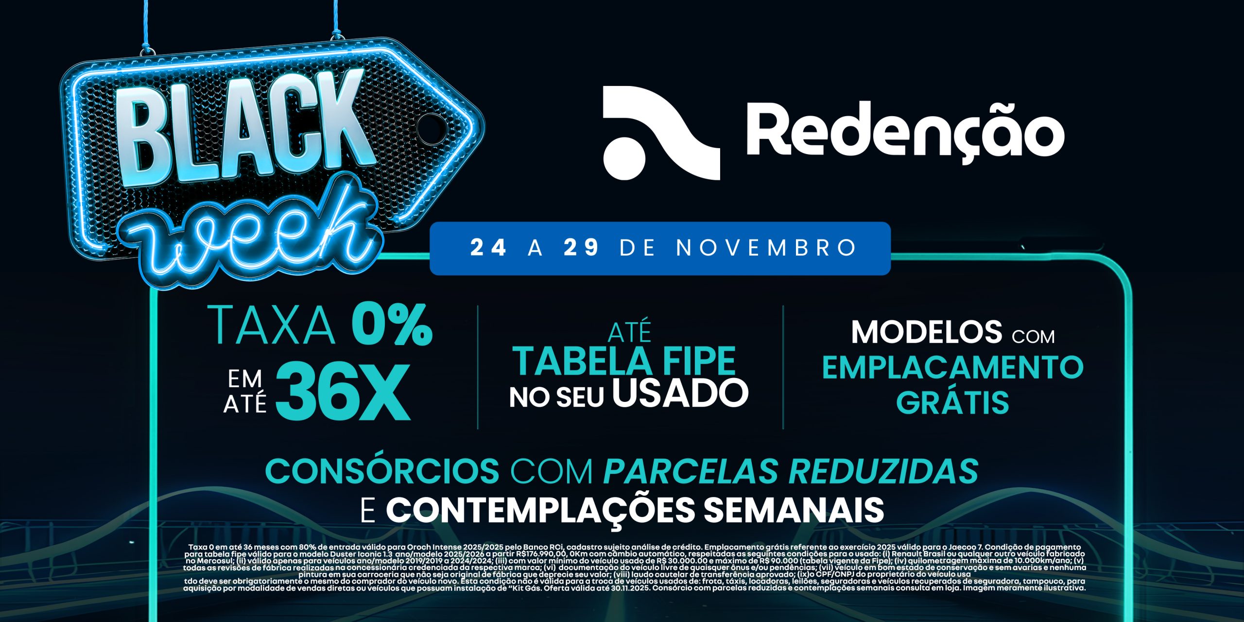 A Black Week Redenção já está em andamento e promete ser a maior ação automotiva do ano no Rio Grande do Norte. O evento, que segue até sábado, dia 29 de novembro, reúne seis grandes marcas em uma operação conjunta inédita no estado: Geely, Omoda Jaecoo, Renault, Nissan, Redenção Seminovos e Consórcio Redenção.