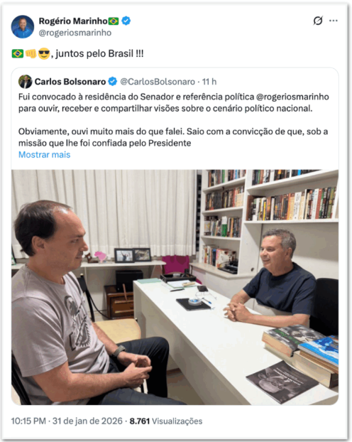 O senador Rogério Marinho (PL-RN) se reuniu com Carlos Bolsonaro (PL) no fim de semana para discutir o cenário político nacional. Em publicação feita no sábado (31), no X, Carlos afirmou que foi convocado à residência de Marinho.