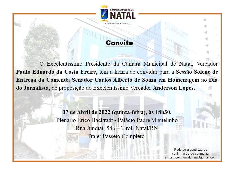 Em alusão ao Dia do Jornalista, celebrado no dia 07 de abril, a Câmara Municipal de Natal entrega, nesta quinta-feira (7), a Comenda Carlos Alberto de Sousa, em homenagem aos profissionais da imprensa natalense. A sessão solene, proposta pelo vereador Anderson Lopes, está marcada para às 18h30 no Plenário da Casa Legislativa.