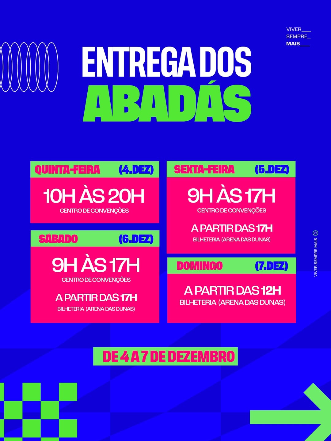 Sábado (06/12): 9h às 17h — Centro de Convenções | A partir das 17h — Bilheteria da Arena das Dunas