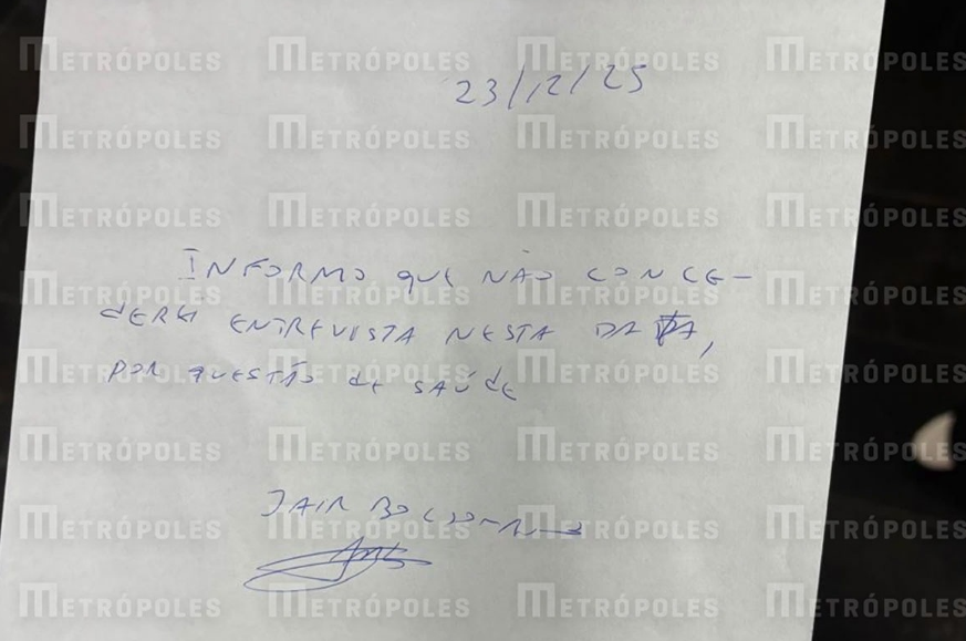 A entrevista aconteceria às 11h desta terça-feira (23/12), no entanto, Bolsonaro cancelou algando ‘questão de saúde’, como mostra um bilhete manuscrito comunicado à coluna de Paulo Cappelli o cancelamento da entrevista.