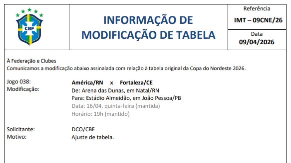 Isso porque a Arena das Dunas não poderá receber a partida em razão do show da dupla Henrique & Juliano e a estrutura para realização do evento precisa ser montada.
