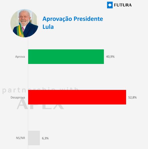 Levantamento nacional realizado pela Futura Inteligência, empresa da Apex Partners mostra que o presidente Lula segue com maioria de desaprovação e não há melhora estatisticamente significativa na aprovação pessoal (oscilação dentro da margem de erro).