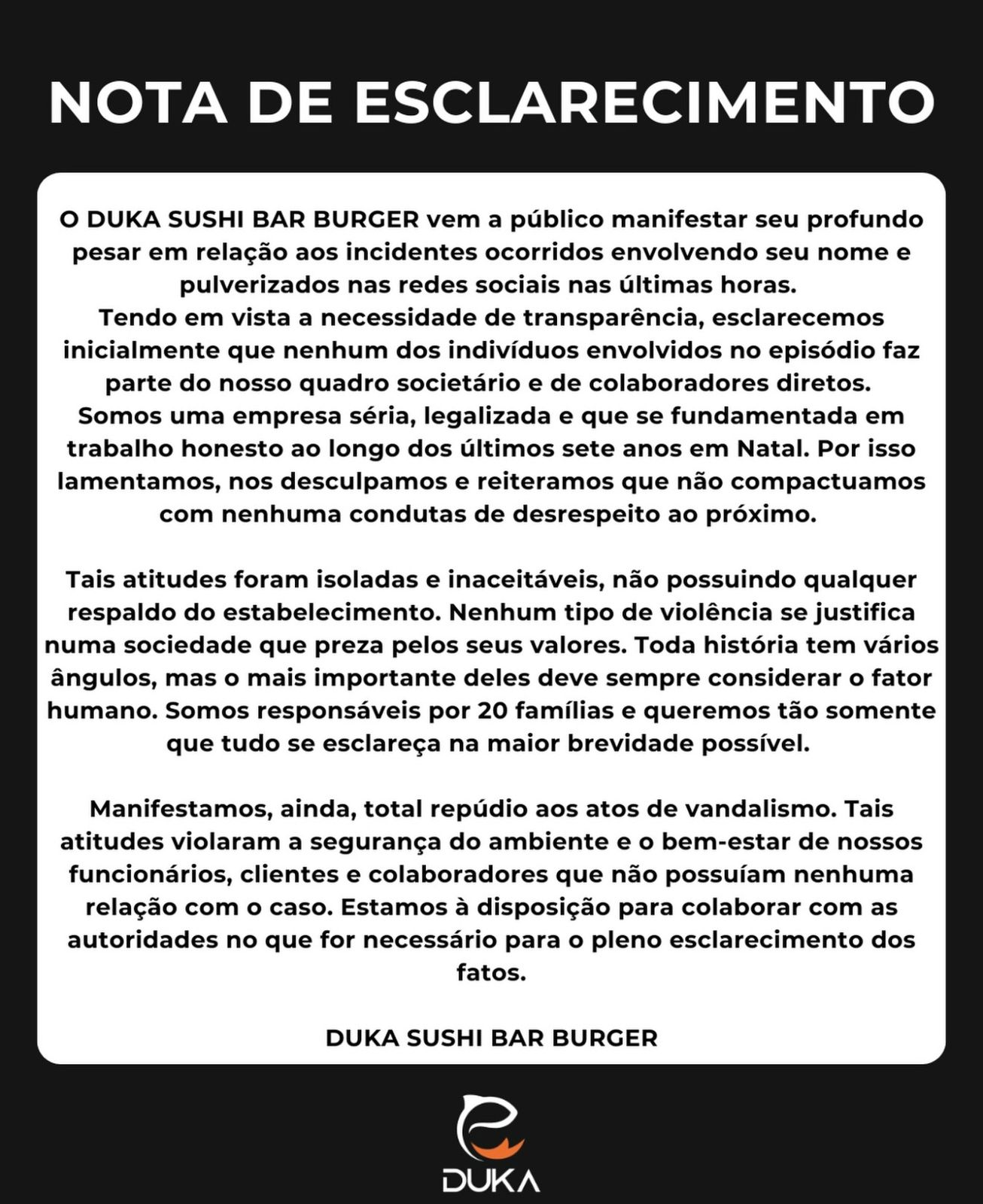 O Duka Sushi Bar Burger divulgou uma nota de esclarecimento após a agressão a um motoboy que aguardava a retirada de um pedido em frente ao restaurante.