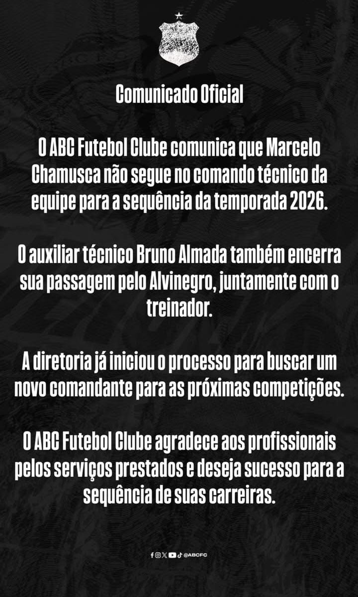 O ABC anunciou a saída do técnico Marcelo Chamusca após a derrota nos pênaltis para o América na final do Campeonato Potiguar, que garantiu o tetracampeonato ao rival. A decisão foi confirmada neste domingo (22).