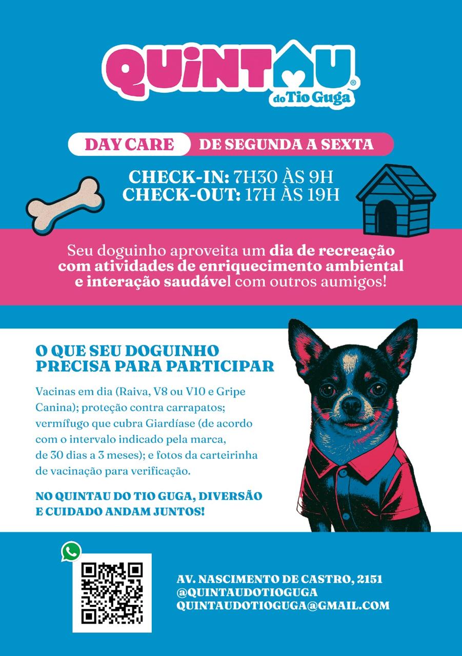 ▪ Mais do que lazer: bem-estar e desenvolvimento. O QuintAU do Tio Guga foi criado para promover experiências positivas, socialização e equilíbrio emocional. Cada dia é planejado com atividades de enriquecimento ambiental, relaxamento e aprendizado, resultando em pets mais felizes, tranquilos e saudáveis — e tutores com mais tranquilidade no dia a dia.