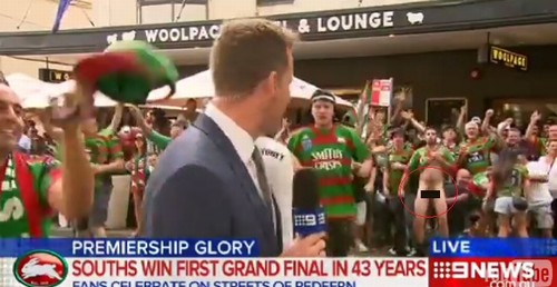 Um torcedor do South Sydney Rabbitohs, time de rúgbi da Austrália, que tem como um dos donos o ator Russell Crowe, acabou se empolgando além da conta após a conquista da Australian National Rugby League. Quando o repórter Tom Steinfort, do Channel 9, estava falando ao vivo do local da comemoração, em Redfern, subúrbio de Sydney, o torcedor mais desinibido mostrou o pênis em rede nacional.