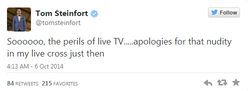 Depois, o repórter pediu desculpa no Twitter pela exibição da nudez durante o seu trabalho: