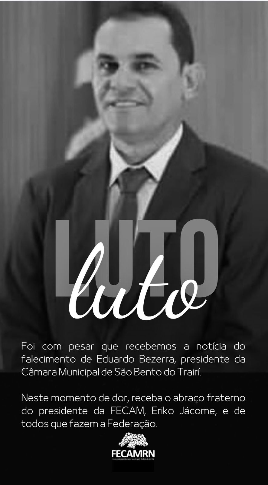 A Federação das Câmaras Municipais do Estado do Rio Grande do Norte (FECAM) manifestou profundo pesar pelo falecimento de Eduardo Bezerra, presidente da Câmara Municipal de São Bento do Trairí.