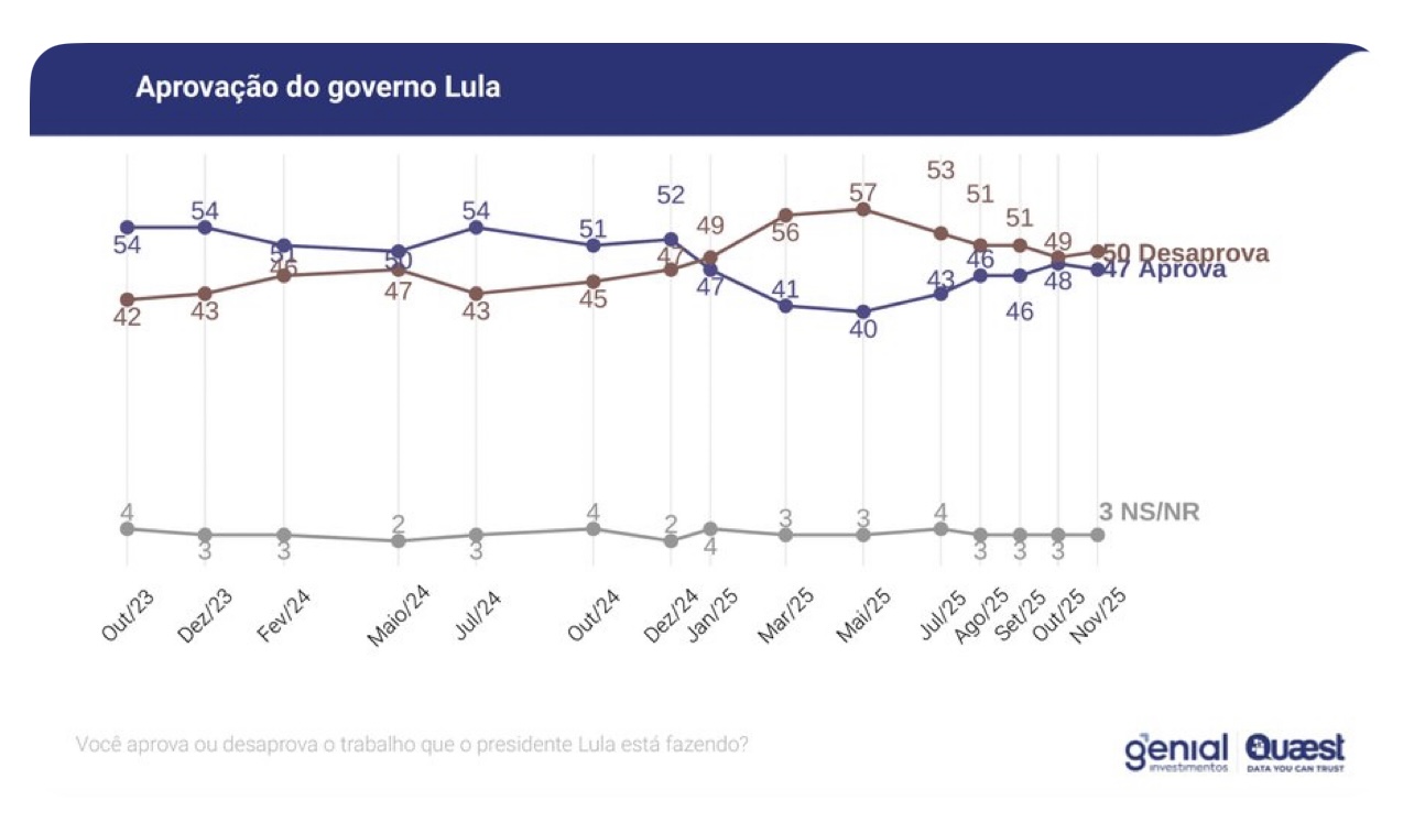 Após meses de leve recuperação, a aprovação do governo Lula voltou a cair. A nova pesquisa Genial/Quaest de novembro de 2025 mostra que 50% dos brasileiros desaprovam o governo e 47% aprovam, uma diferença de três pontos percentuais.