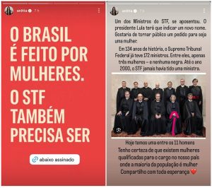 Com a aposentadoria de Luís Roberto Barroso, Anitta quer que a quarta mulher finalmente ocupe a Corte. “O Brasil é feito por mulheres. O STF também precisa ser”, escreveu, compartilhando um abaixo-assinado que já soma mais de 25,5 mil assinaturas na noite desta terça.
