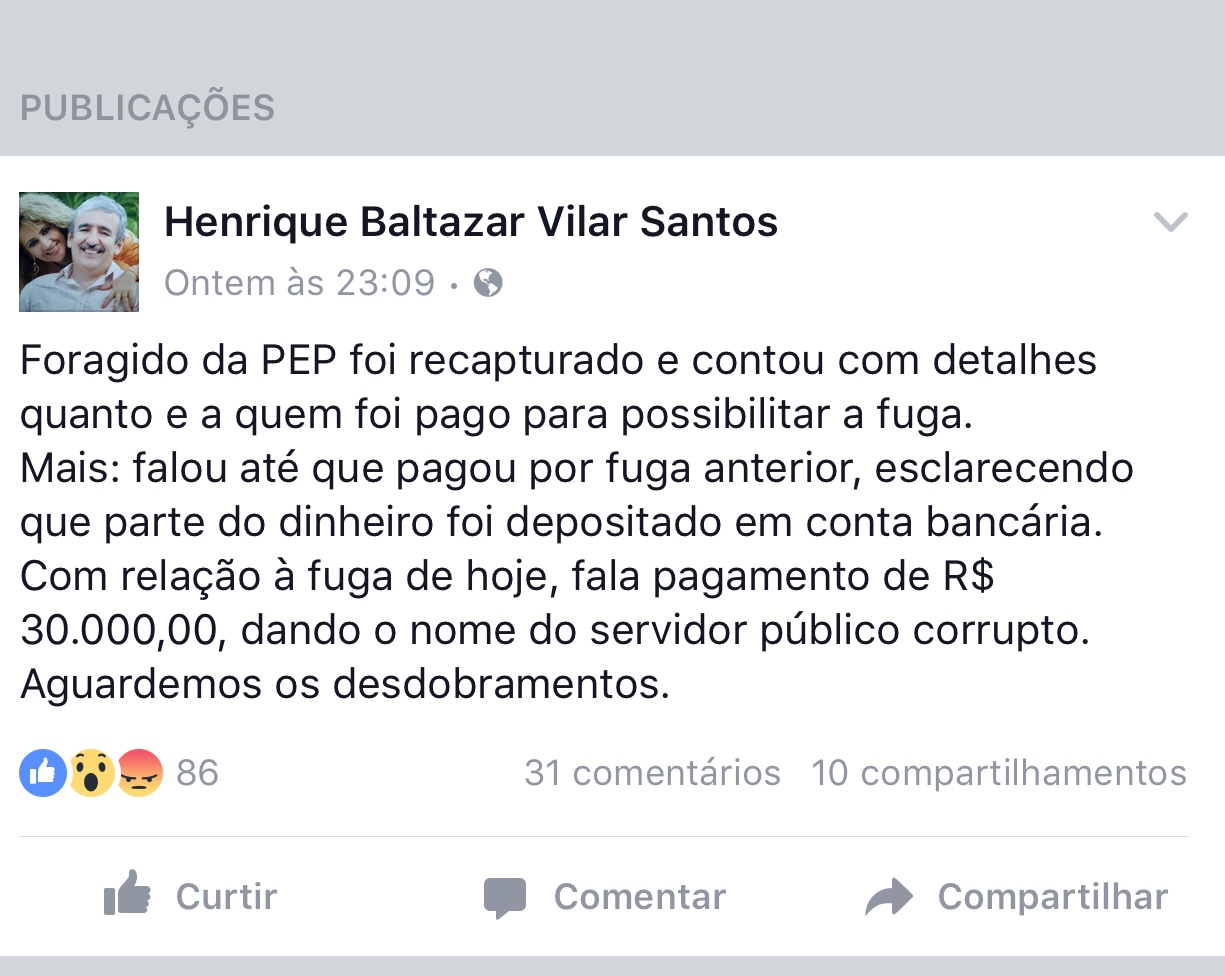 Juiz da Vara de execuções penais, dr Henrique Baltazar usou seu Facebook neste sábado para dizer que um dos presos recapturados do PEP que fugiram no dia de ontem confessou que pagou para fugir, disse quem recebeu é que custou R$ 30.000,00. Muito grave. Veja o post de Baltazar abaixo: