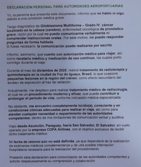 No documento, redigido em espanhol, Vasques diz não conseguir falar nem ouvir, solicitando que qualquer comunicação seja feita por escrito. “Não posso responder perguntas de forma falada. Se necessário, a comunicação pode ser feita por escrito”, escreveu.
