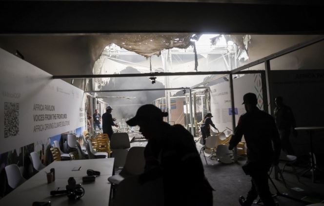 Uma imagem divulgada pela agência Reuters mostra os estragos causados pelo incêndio que atingiu um pavilhão da COP30, nesta quinta-feira (20), na Zona Azul, em Belém (PA). Não há registro de feridos.