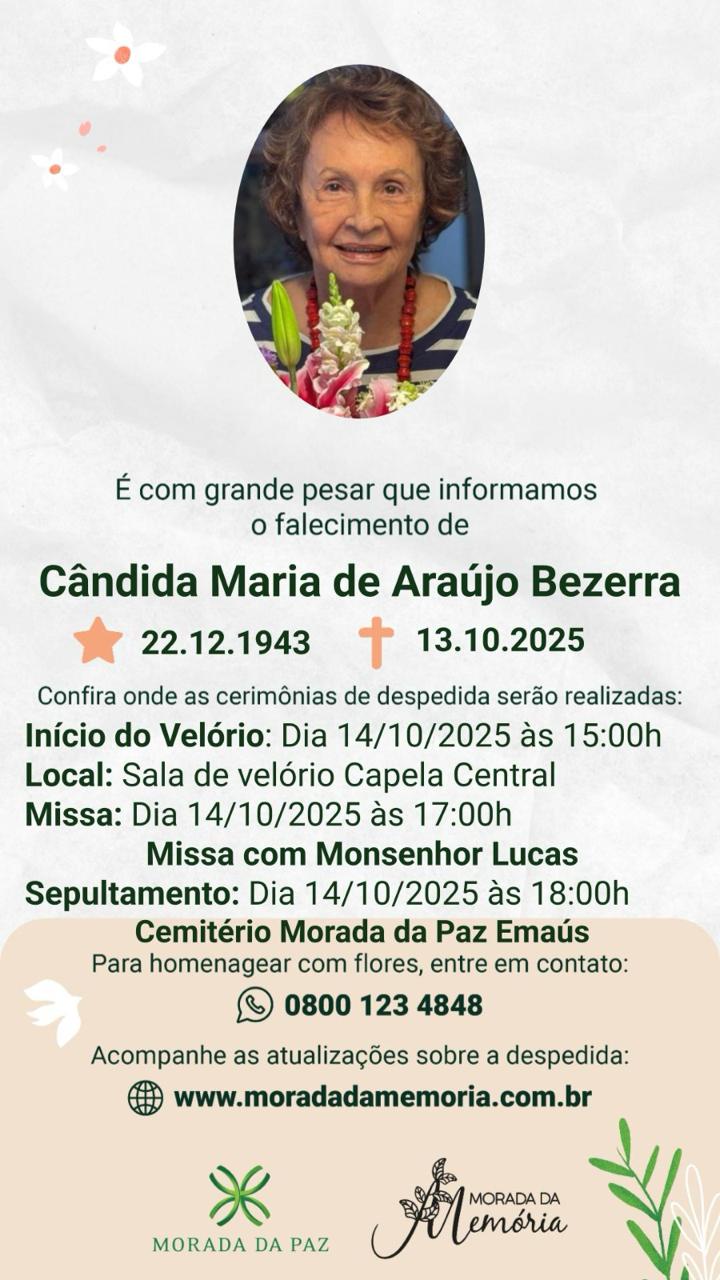 Início do Velório: Dia 14/10/2025 às 15h Local: Sala de velório Capela Central do Cemitério Morada da Paz Emaús Missa: Dia 14/10/2025 às 17h – Missa com Monsenhor Lucas Sepultamento: Dia 14/10/2025 às 18h