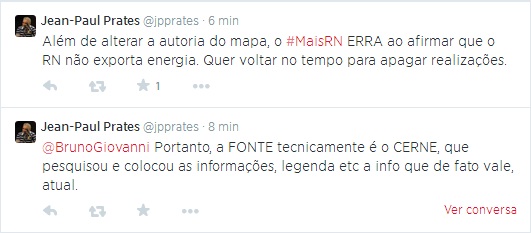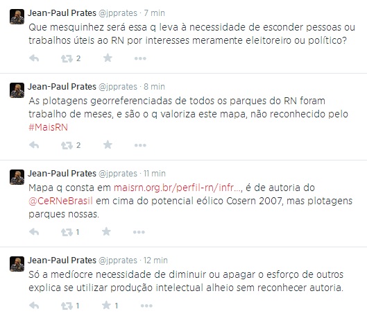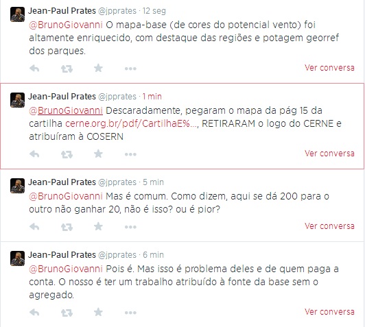 O ex-secretário de energia do Governo Wilma e Presidente do CERNE – Centro de Estratégias em Recursos Naturais e Energia, Jean-Paul Prates fez um denuncia grave nesta sexta pela manhã no twitter, segundo Jean, a FIERN no estudo do MAIS RN que será lançado hoje, “roubou” o mapa-base (de cores do potencial vento) do trabalho do CERNE, colocou dentro do MAIS RN colocando o crédito para a Cosern. Vejam os posts de Jean: