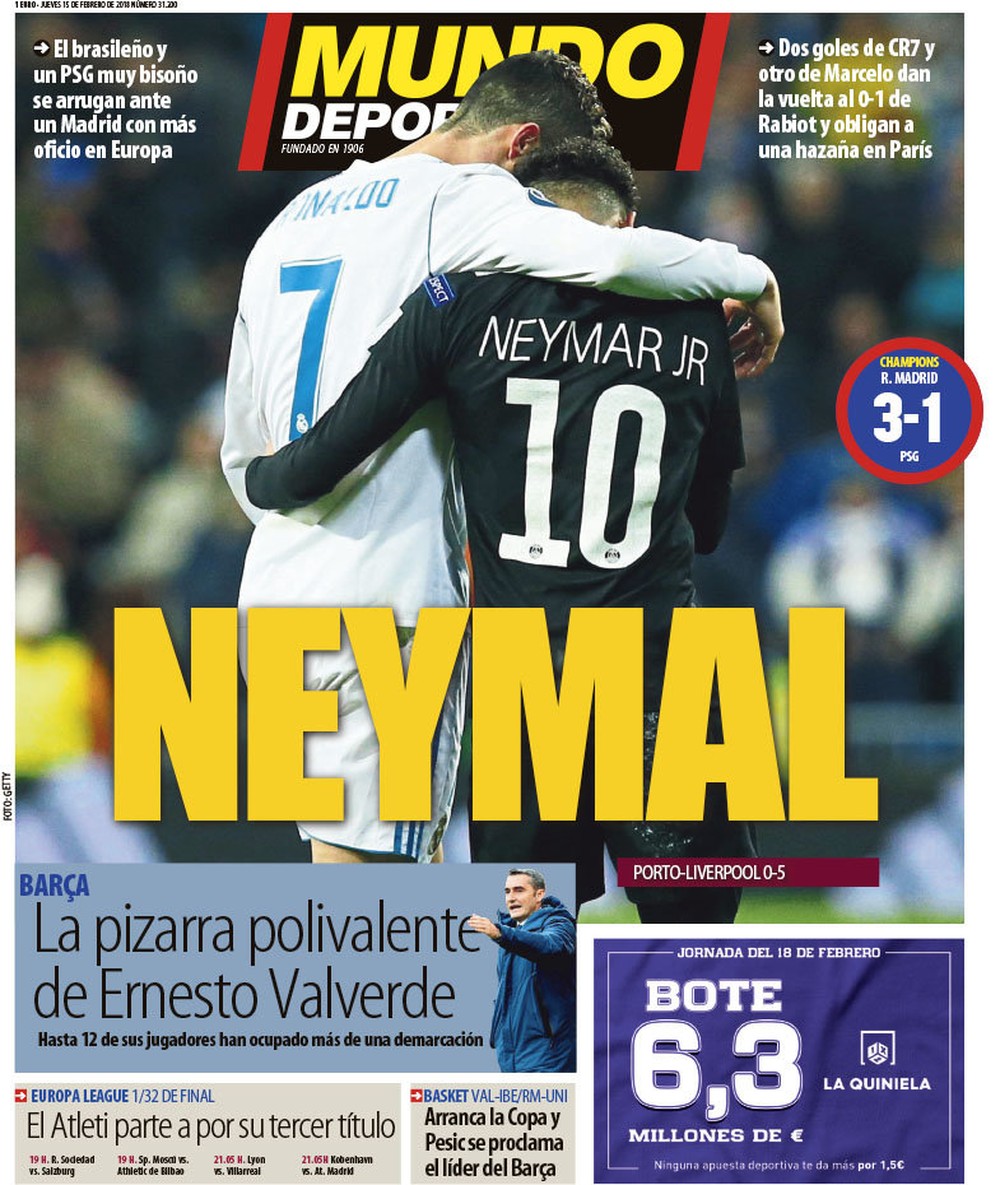 Alguns dos principais jornais europeus criticaram a atuação de Neymar diante do Real Madrid, no jogo de ida das oitavas de final da Liga dos Campeões. Tanto o espanhol “Mundo Deportivo” com o italiano “Gazzetta dello Sport” estamparam manchetes em que o brasileiro foi chamado de “Neymal”. Na opinião do comentarista Walter Casagrande, o camisa 10 do PSG e Seleção precisa adotar uma postura mais coletiva, mudando o seu comportamento. Para o ex-jogador, Neymar é “mimado”. E uma postura condescente de torcedores, imprensa e dos que o cercam o atacante está ajudando a criar “um monstro”.