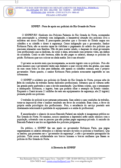 O SINPEF-RN -Sindicato dos Policiais Federais do Rio Grande do Norte, acompanha com preocupação e, sobretudo com indignação, a lamentável situação dos policiais civis e militares em nosso Estado. É preocupante perceber que o Governo do Estado negue aos cidadãos e as cidadãs o direto à segurança. Causa indignação que o governador, Senhor Robinson Faria, não se mostre capaz de viabilizar o pagamento do salário dos policiais que precisam alimentar suas famílias. Não dá para aceitar calado, o desprezo do atual governante com profissionais que se dedicam, de corpo a alma, arriscando suas próprias vidas, em defesa da sociedade. Como se não bastasse, além de não pagar os salários, ameaça os policiais de prisão. Robinson quer nos colocar na idade média. Isto é um absurdo!