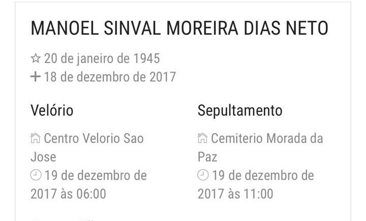 Faleceu na noite desta segunda-feira no hospital São Lucas vítima de uma hemorragia digestiva grave o empresário Sinval Moreira Dias.
