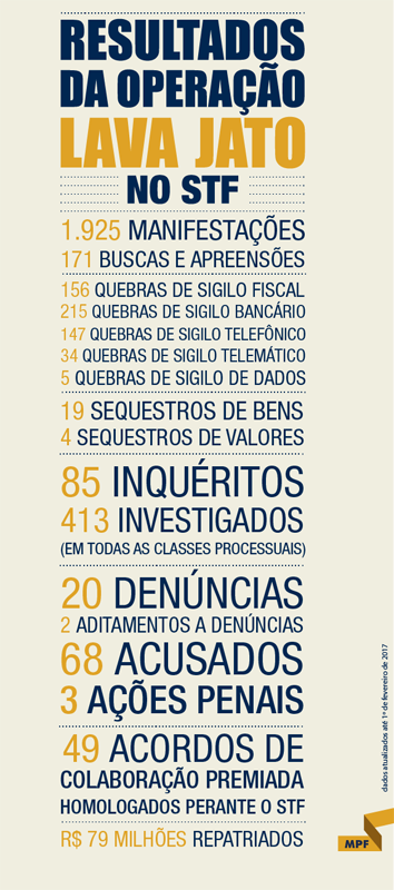 O site do MPF aponta alguns dos resultados da operação no Supremo. De acordo com os dados, são 85 inquéritos no STF e 413 investigados em todas as classes processuais. As informações foram atualizadas em 1º de fevereiro e não incluem, por exemplo, as 77 delações premiadas da Odebrecht homologadas pela ministra Cármen Lúcia.