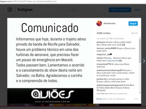 “Informamos que hoje, durante o trajeto aéreo privado da banda de Recife para Salvador, houve um problema técnico em uma das turbinas da aeronave, que precisou fazer um pouso de emergência em Maceió. Todos passam bem. Lamentamos o ocorrido e o cancelamento do show desta noite em Salvador, na Bahia. Agradecemos o carinho e a comprensão de todos”.