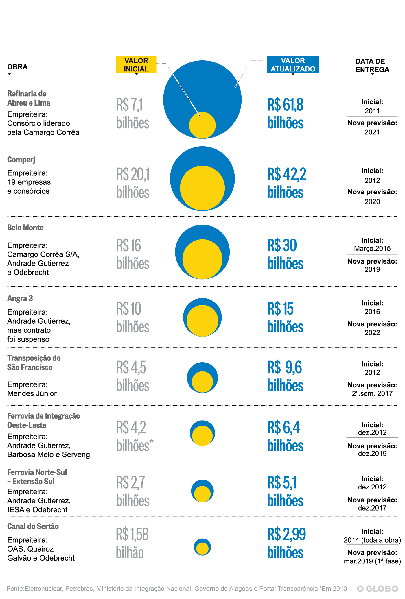Pelo menos oito grandes obras de infraestrutura, consideradas prioritárias e sob responsabilidade de empresas investigadas pela operação Lava-Jato, serão entregues até uma década depois do prazo original e com despesas muito acima da previsão inicial. Anunciadas em sua maior parte num cenário econômico favorável, elas somavam custos de R$ 66,1 bilhões. Hoje, alcançam R$ 173 bilhões — R$ 106,9 bilhões além do planejado.