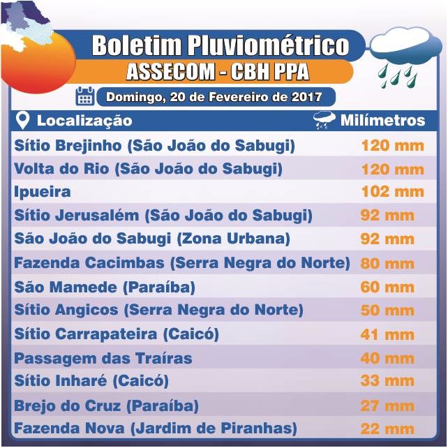 O Domingo foi de boas chuvas em várias cidades do RN. Caiu água no Oeste e no Alto Oeste. No Seridó choveu bastante em São João do Sabugi, fazendo acudes sangrar. Veja alguns números da região do Seridó.