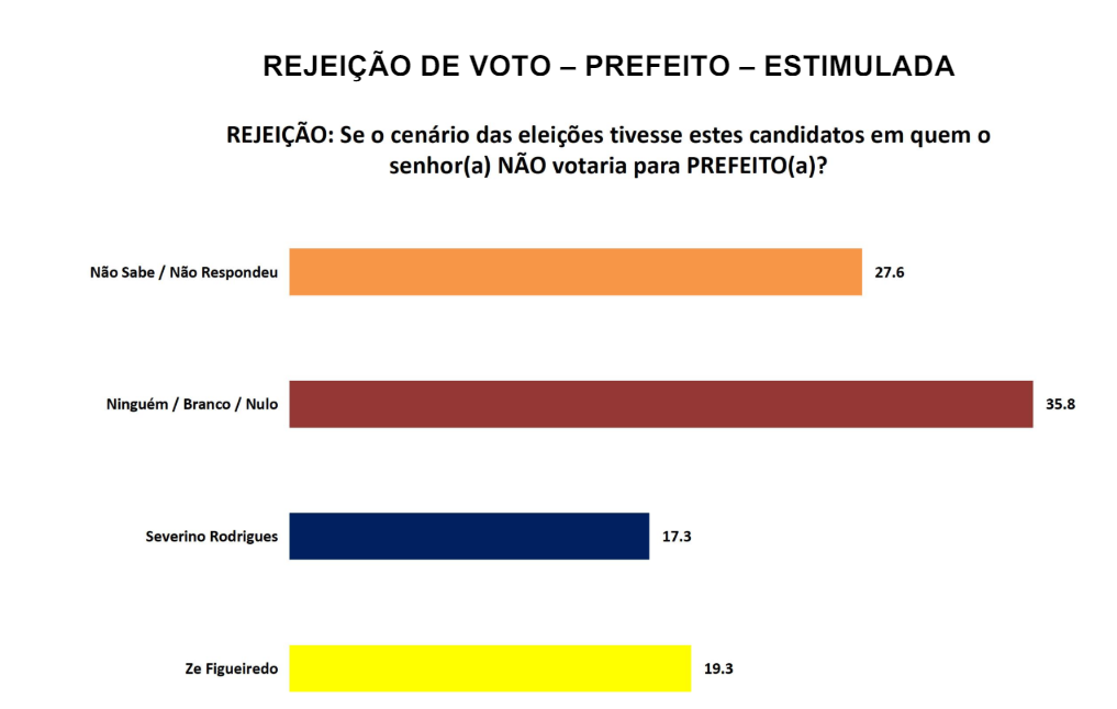 PESQUISA SETA/ BG/ SÃO JOSÉ DE MIPIBU perguntou aos entrevistados em quem não votariam para Prefeitura. Zé Figueiredo foi o mais rejeitado por 19,3%, enquanto 17,3% rejeitam Severino. Já 35,8% não rejeitam ninguém ou votariam branco/nulo e 27,6% não responderam.