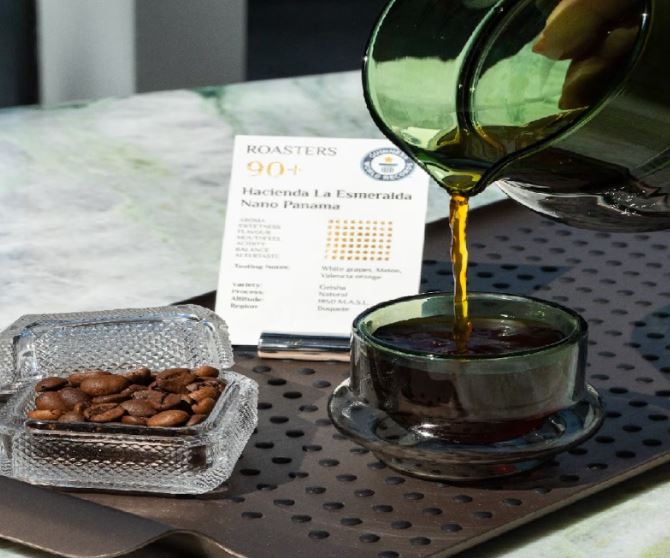 Esse cafezinho de luxo foi feito com grãos da variedade geisha cultivados na Hacienda La Esmeralda, no Panamá. A fazenda é reconhecida internacionalmente por produzir alguns dos cafés mais raros e valiosos do mundo.