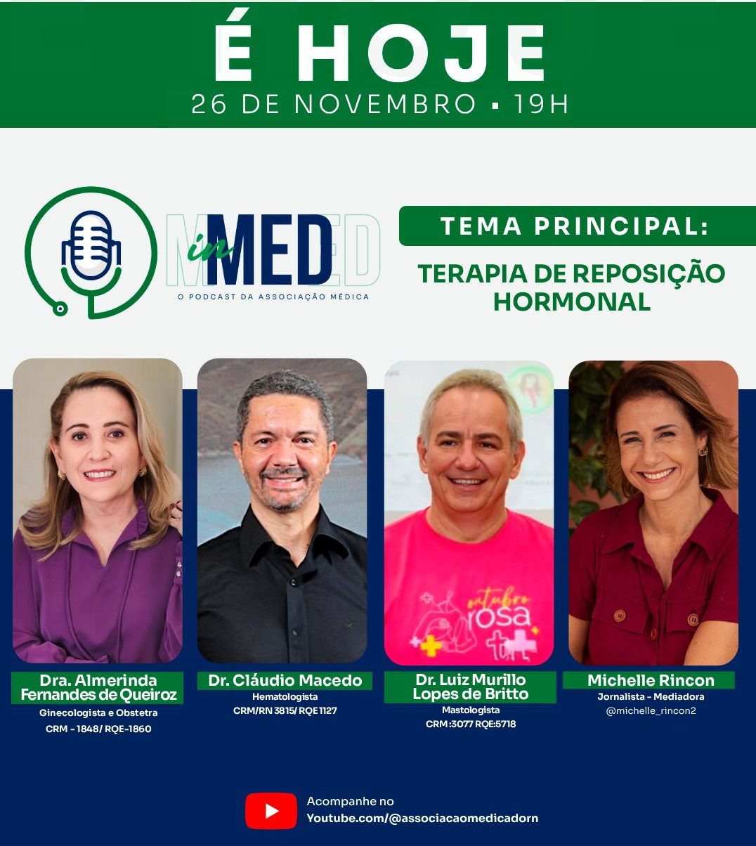 O InMED Podcast recebe nesta terça-feira (26), às 19h, três especialistas para um debate direto, esclarecedor e baseado em evidências sobre Terapia de Reposição Hormonal, tema que movimenta consultórios, divide opiniões e desperta dúvidas em mulheres, homens e profissionais de saúde.