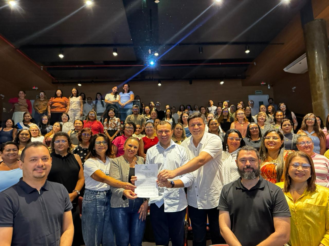 Antes de comunicar oficialmente o reajuste ao público presente, Emídio Jr. destacou avanços e iniciativas de sua gestão voltadas ao setor de Educação, como: implantação do transporte universitário, melhoria no cardápio da merenda, distribuição de kits com materiais escolares entrega de fardamento completo.