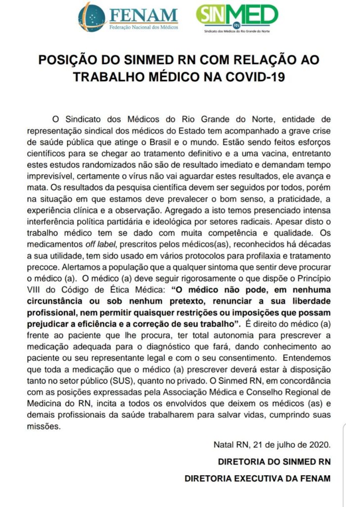 O Sindicado dos Médicos do Rio Grande do Norte – SINMED, respaldado pela Federação Nacional dos Médicos – FENAM, emitiu nota no último dia 21, afirmando que tem presenciado intensa interferência política partidária e ideológica em relação ao uso de medicamentos para tratamento de pacientes com covid-19. O sindicato faz um alerta à população para que busque atendimento médico ao sentir qualquer sintoma.