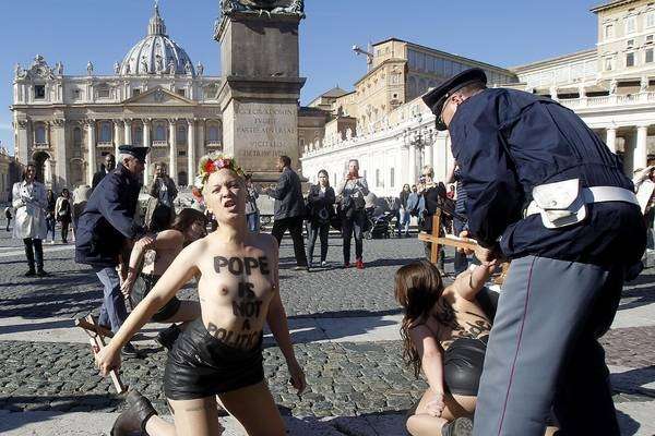No corpo de uma das manifestantes era possível ler a frase “Pope is not a politician” (“Papa não é um político”), enquanto as outras escreveram nas costas “Keep it inside” (“Mantenha dentro”) e exibiam, de maneira provocativa, uma cruz.