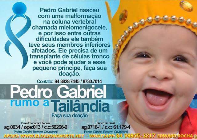 “Os pais de Pedro Gabriel sonham com uma maior autonomia do seu filho, para que ele não precise mais da sonda urinária e quem sabe possa até mesmo andar. Pedrinho precisa de um transplante de células tronco e, por isso, precisa viajar, no próximo dia 2 de setembro, para Tailândia onde o procedimento será realizado”, disse o Capitão Marcos Miranda.