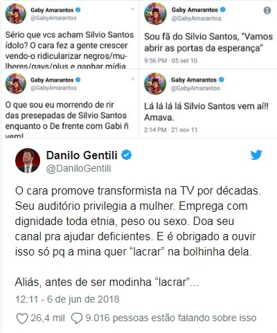 Por interinoDanilo Gentil saiu em defesa do patrão Silvio Santos após as críticas da cantora Gaby Amarantos. Na terça-feira, o dono do SBT chamou Preta Gil de gorda durante a gravação do Programa Silvio Santos.