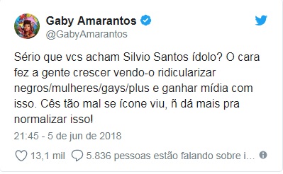 Em defesa da artista e amiga, Gaby Amarantos tuítou que brincadeiras que ridizularizam minorias não são mais aceitáveis em 2018. Ela também criticou quem considera o apresentador, de 87 anos, um “ícone”.