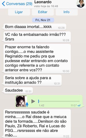 “VC não ta embalsamado irmão???”, questionou o falso Leonardo a Zé Roberto, em uma brincadeira com a idade do atleta de 40 anos. Zé Roberto foi companheiro de Leonardo, o verdadeiro, na Copa do Mundo de 1998. Depois de duas mensagens, o cidadão fez menção a uma ajuda para a “instituição amado”.