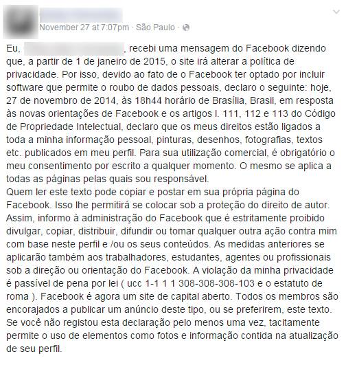 Mas afinal, por que postar isso não muda em nada? Em primeiro lugar, ao criar uma conta no Facebook, o usuário concorda com os termos de uso e política de privacidade. Caso eles mudem enquanto utiliza o serviço e a pessoa não concordar, ela pode desativar seu perfil.