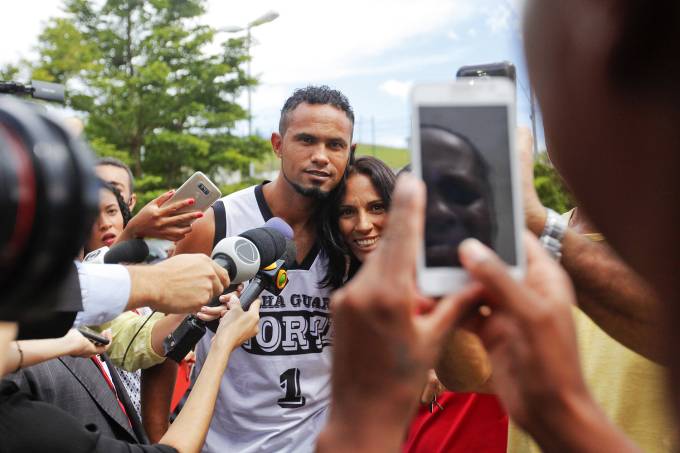 “O Bruno acabou de sair da prisão provisória. Tem a vida toda para cuidar. É preciso ter um pouco de paciência. Ele vai falar no momento adequado”, afirmou o advogado Lúcio Adolfo, enquanto o goleiro permaneceu de cabeça baixa, com as mãos nas costas.