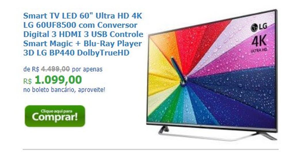 Falsa oferta de TV LED 60” Ultra HD 4K da LG (Foto: Reprodução)