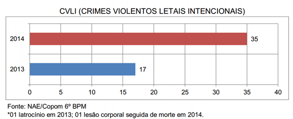 O Núcleo de Análises Estatístico do 6º BPM, divulgou os dados sobre as ocorrências registradas ao longo de 2014 em Caicó. Os números revelam um aumento em diversos crimes. É o caso dos homicídios. No período de 01 de janeiro a 31 de dezembro de 2014, foram 35 Crimes Violentos Letais Intencionais – CVLI. No ano anterior, foram registrados 17. Outro número com aumento é o das tentativas de homicídio. Este ano, foram registradas 46, contra 26 de 2013.