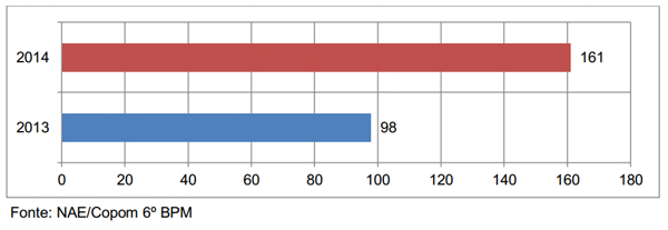 Os dados divulgados revelam também um aumento significativo, sendo 161 casos registrado em 2014. Foram 63 roubos a mais que em 2013. Muitos dos roubos foram ações onde os ladrões entraram nas casas, de arma em punho, usando capuz pra cobrir o rosto e fizeram arrastões levando objetos valiosos.