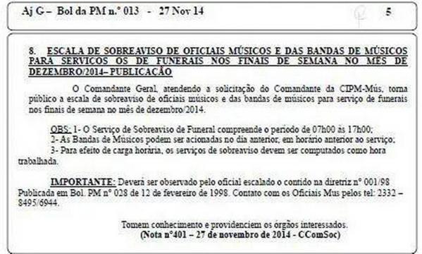 Uma iniciativa tratada como medida burocrática pelo comando da PM vem provocando críticas de policiais nas redes sociais. O boletim interno da corporação publicou um informe colocando os policiais militares da Companhia de Músicos de sobreaviso para possíveis serviços de funerais nos finais de semana de dezembro. O boletim nº 013, de 27 de novembro, estabelece que o sobreaviso é válido para o período das 7h às 17h. No entanto, os músicos poderão ser acionados em qualquer outro horário, de acordo com o comunicado.