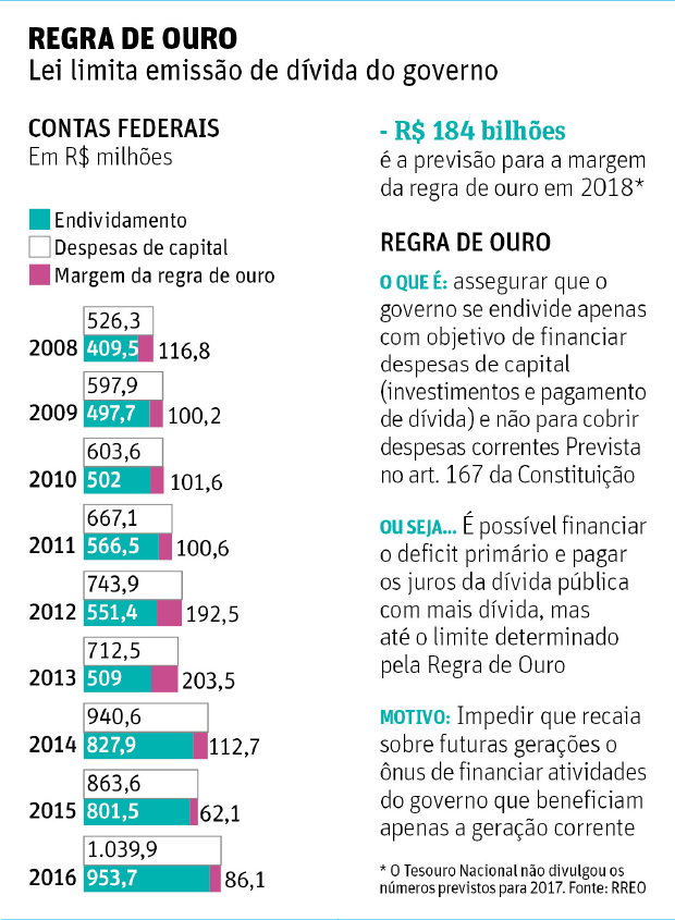Para evitar que Michel Temer e o futuro presidente da República, empossado em janeiro de 2019, sejam acusados de crime de responsabilidade, governistas e a equipe econômica trabalham em uma PEC (proposta de emenda à constituição) para suspender a “regra de ouro” –que impede a União de emitir dívida em volume superior a investimentos.