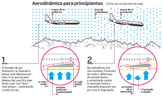 Turbulência não derruba avião. Os jatos modernos são projetados para resistir a ela. Você já ouviu esse discurso? É uma meia-verdade. Um levantamento feito pela Federal Aviation Administration (FAA), agência do governo americano que estuda a segurança no ar, revela que entre 1992 e 2001 houve 115 acidentes fatais em que a turbulência esteve envolvida, deixando 251 mortos. Na maior parte dos casos, eram aviões pequenos, mas também houve mortes em aeronaves comerciais – as vítimas eram passageiros que estavam sem cinto de segurança, e por isso foram arremessados contra o teto a até 100 km/h (velocidade suficiente para causar fratura no pescoço). Ou seja: em caso de turbulência, o maior perigo não é o avião cair. É você se machucar porque está sem cinto. Os aviões têm instrumentos que permitem detectar com antecedência as zonas turbulentas, dando tempo para desviar, mas isso nem sempre é possível: existe um tipo de turbulência, a “de ar limpo”, que não é captada pelos instrumentos da aeronave. Felizmente, é rara: só causou 2,88% dos acidentes fatais.